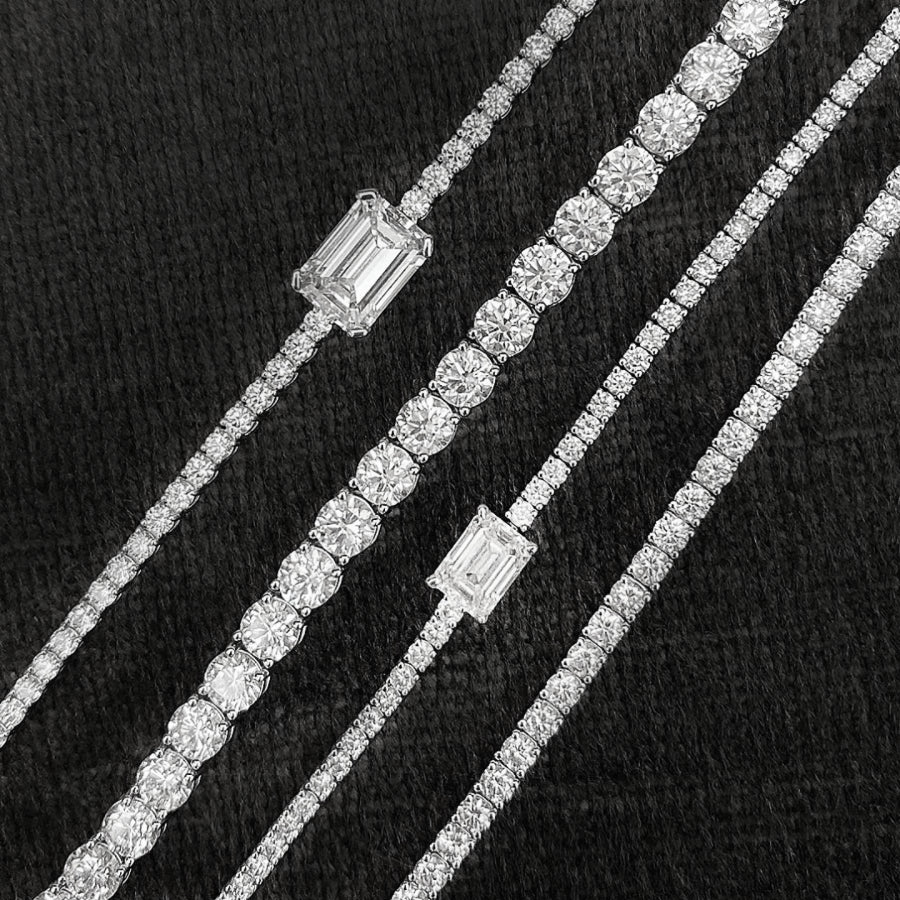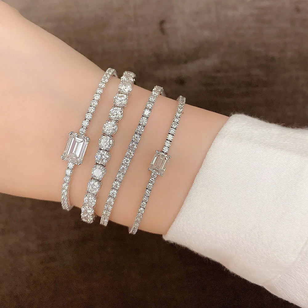 Step into sophistication with our Tennis Bracelet featuring a mesmerizing Emerald Diamond Center Stone. Delicately crafted to perfection, this bracelet boasts an emerald-cut diamond centerpiece, radiating elegance and allure. Encircled by a dazzling array of diamonds along the bracelet's length, each stone sparkles with unparalleled brilliance. The emerald's rich green hue adds a touch of opulence, making this bracelet a timeless statement piece for any occasion. Whether worn solo for a touch of refined glamour or paired with other accessories for a layered look, this exquisite bracelet is sure to captivate hearts and turn heads wherever you go.